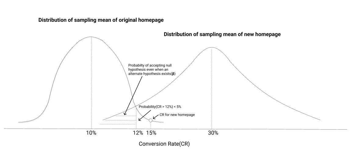 However, there is another problem when we blindly reject the null hypothesis. Suppose an alternate hypothesis exists(CR is not 10%). If we take many samples for the new page(our test group) users and measure the CR, the distribution of the CRs will look like the right curve below -