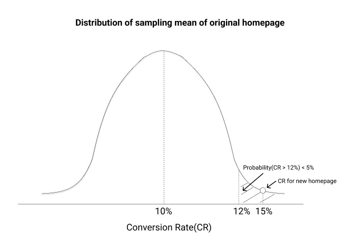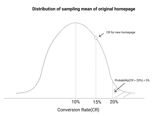 Going back to the CR for our new page which came out to be 15%, we need to ask what is the probability that the CR will be 15% or more for a sample of users on our original homepage.